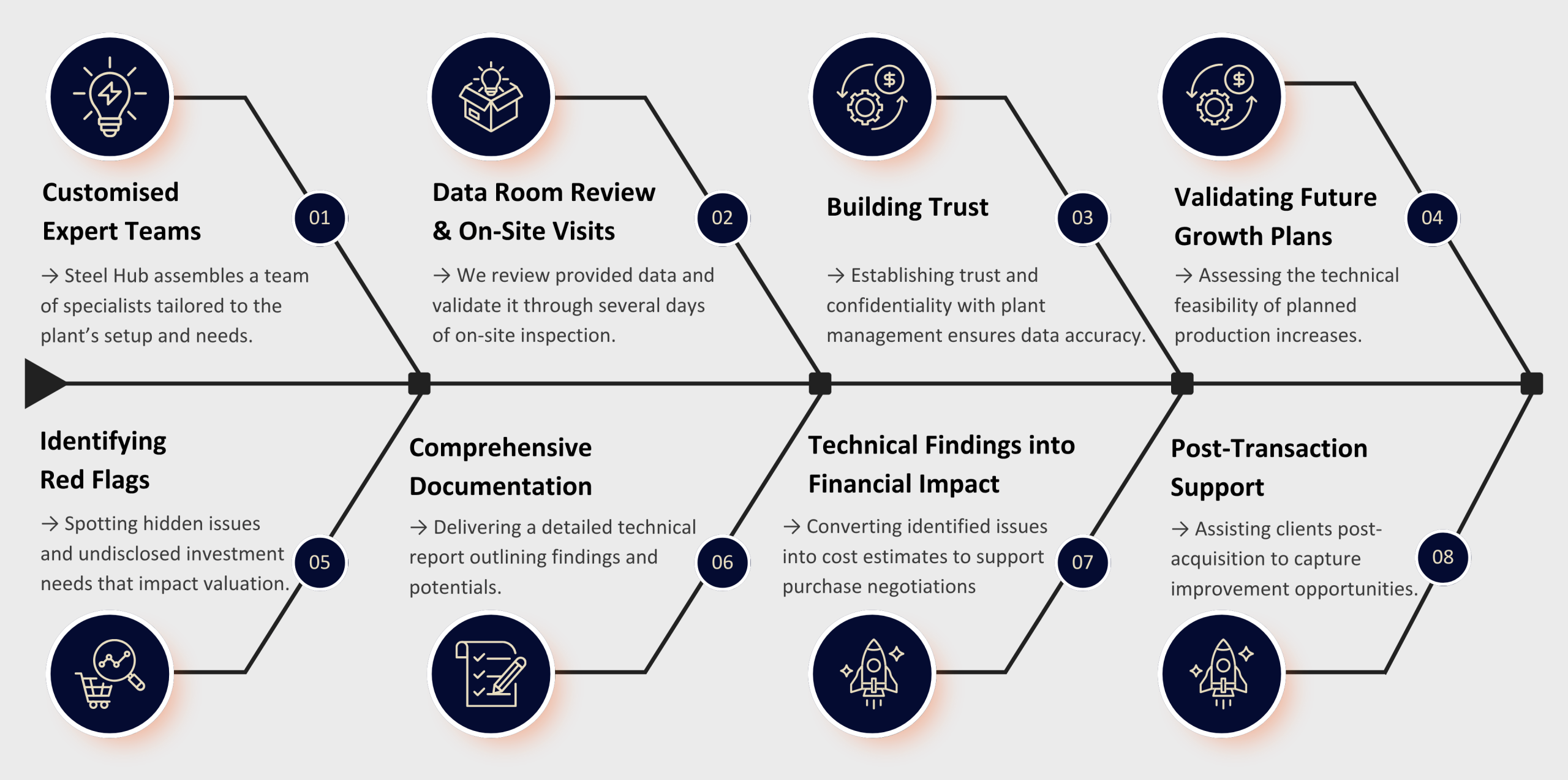 - Post-transaction support: After a successful acquisition, Steel Hub can continue to assist clients with operational improvements based on the problems and opportunities identified during the due diligence process, for future value capture.